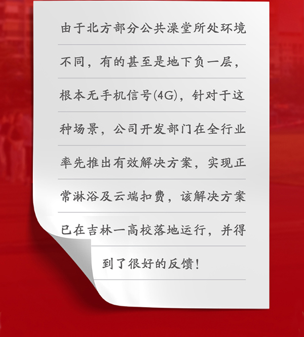 由于北方部分公共澡堂所處環境不同,有的甚至是地下負一層,根本無手機信號(4G),針對于這種場景,公司開發部門在全行業率先推出有效解決方案,實現正常淋浴及云端扣費,該解決方案已在吉林一高校落地運行,并得到了很好的反饋!